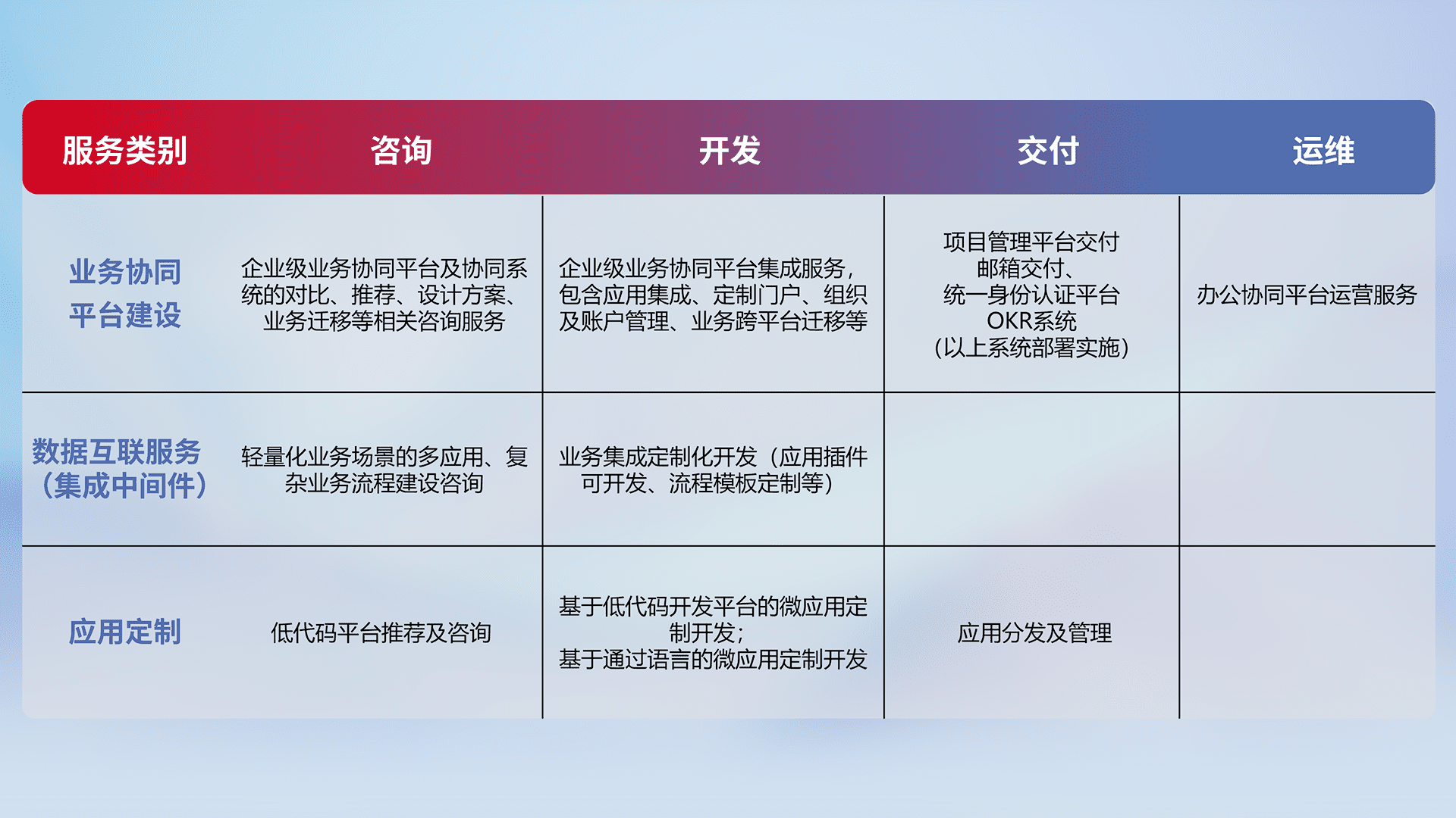针对钉钉、、企微、、、IDaas等平台级产品提供产品的规划、、、方案、、、、交付、、定制化开发等服务,,,,实现如统一协同办公、、、、智能客户服务、、混合会议管理、、、智能数据查询、、、等业务场景,,,,实现数字化转型。。。。